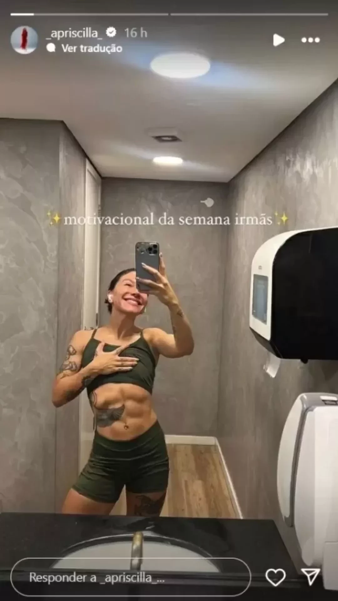 Priscilla posou em frente ao espelho no banheiro e exibiu seu abdômen trincado após uma sessão de malhação. A cantora publicou a foto nesta semana, vestindo um conjuntinho verde militar de top e shorts, e aproveitou o momento para incentivar seus seguidores.