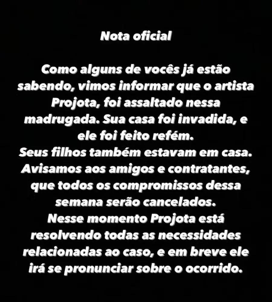 “Como alguns de vocês já estão sabendo, vimos informar que o artista Projota, foi assaltado nessa madrugada. Sua casa foi invadida, e ele foi feito refém. Seus filhos também estavam em casa. Avisamos aos amigos e contratantes, que todos os compromissos dessa semana serão cancelados. Nesse momento Projota está resolvendo todas as necessidades relacionadas ao caso, e em breve ele irá se pronunciar sobre o ocorrido”, disse.