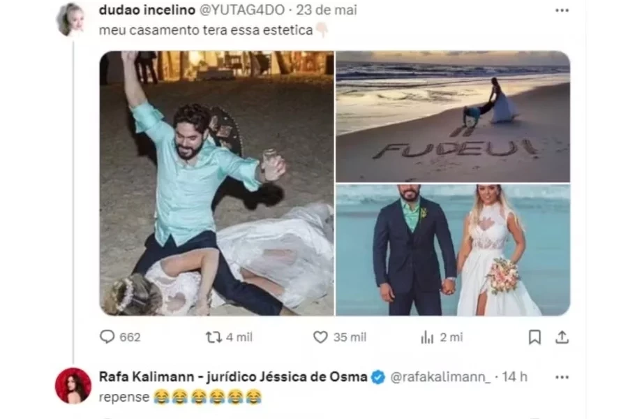 "Meu casamento terá essa estética", escreveu um perfil no X (antigo Twitter), que recebeu uma resposta bem-humorada da atriz: "Repense", acompanhada de vários emojis de risos. Ela e Rodolfo ficaram juntos por dois anos, mas ela decidiu pôr fim na relação após descobrir uma traição.