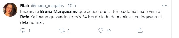 "Certeza que quando a Bruna se tranca no quarto para dormir, a primeira coisa que ela fala é 'por que chamou essa Rafa?'", diz um dos posts. "A Bruna Marquezine vai acabar afogando a Rafa Kalimann no mar dessa ilha. Tô avisando", afirma outro. "Imagina a Bruna Marquezine que achou que ia ter paz lá na ilha e vem a Rafa Kalimann gravando Stories 24 horas do lado da menina... eu jogava o celular dela no mar.", escreveu mais uma pessoa.