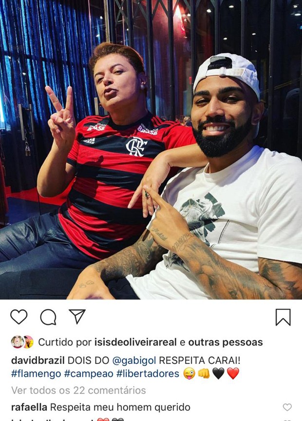 Rafaella Santos elogiou o namorado, Gabigol, ao deixar um comentário em um post de David Brazil celebrando a vitória do Flamengo na final da Libertadores da América, sobre o River Plate, neste sábado (23), em Lima, no Peru - a conquista do rubro-negro veio com dois gols do jogador sobre o River Plate. "Dois do Gabigol, respeita cara!", disse o promoter. "Respeita meu homem, querido", avisou a irmã de Neymar.