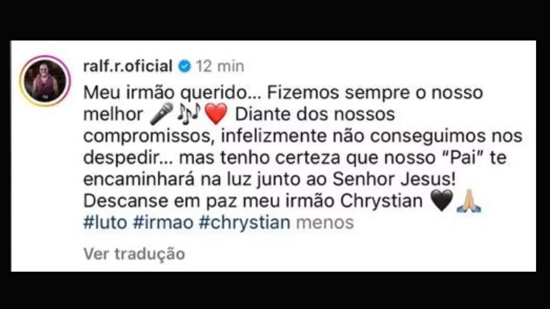 "Meu irmão querido... Fizemos sempre o nosso melhor. Diante dos nossos compromissos, infelizmente não conseguimos nos despedir... mas tenho certeza que nosso "Pai" te encaminhará na luz junto ao Senhor Jesus! Descanse em paz meu irmão Chrystian 🖤🙏 #luto #irmao #chrystian"