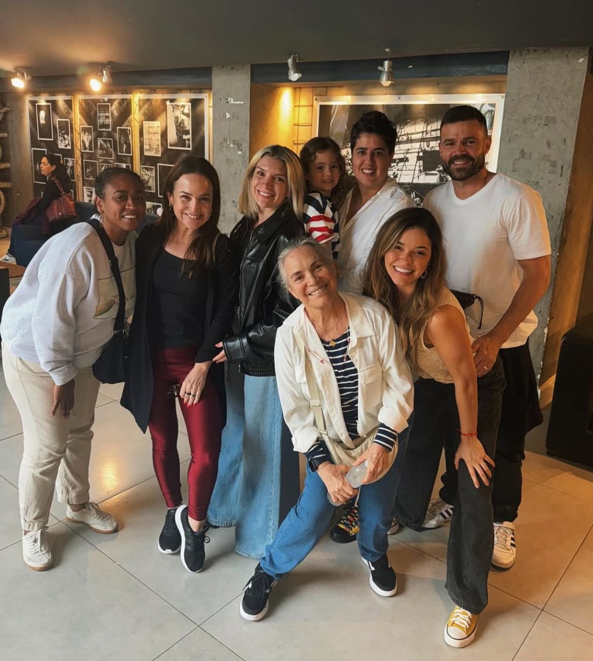 A atriz Regina Duarte, de 78 anos, surgiu sorridente em um raro clique familiar neste sábado (13) ao acompanhar um momento especial: a estreia do neto João Gabriel Alves Gomez, de 11 anos, nos palcos.
