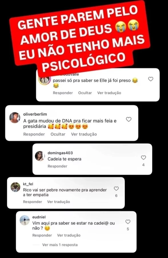 "Gente, eu tô recebendo muita mensagem de carinho, tá? Quero deixar isso claro pra vocês. Porém, tem muita gente maldosa. Muita, muita, muita. Eu já tenho problemas com ansiedade, vocês conhecem a minha história aqui da internet. Então, esses comentários acabam comigo. Eu tento não acompanhar, só que as pessoas ficam comentando no meu próprio Instagram", explicou.