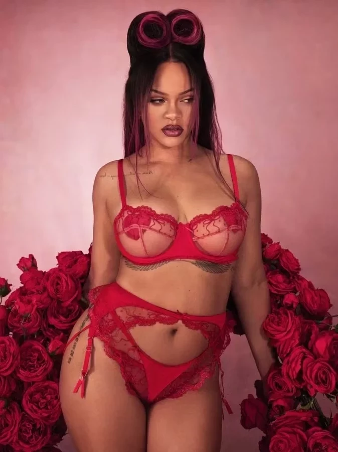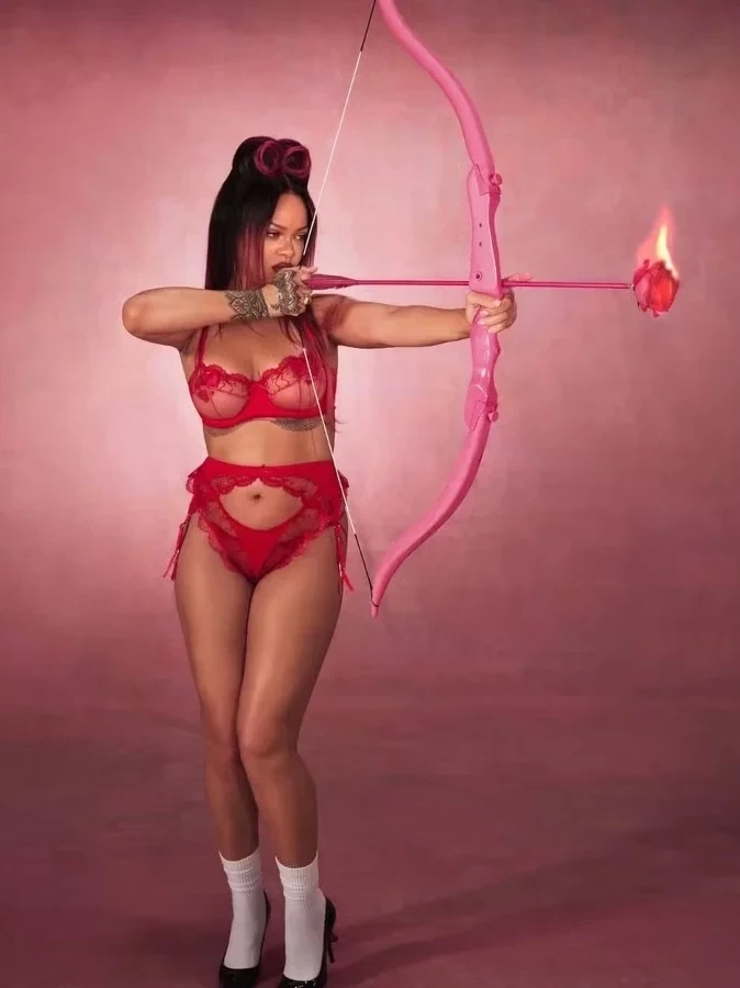 Riri, como é chamada pelos fãs, posou segurando um arco e flecha na cor rosa, onde a flecha era uma rosa vermelha. Além disso, ela também usou um aro de rosas enquanto exibia o corpo em uma lingerie vermelha, com transparência nos seios e corações para cobrir os mamilos. A parte de baixo do conjunto é fio dental, cobrindo apenas o necessário. Ambas as peças são de sua marca SAVAGE X FENTY.