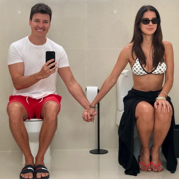 Rodrigo Faro decidiu compartilhar com seus seguidores alguns detalhes de sua mansão em São Paulo (SP). No domingo (03) ele publicou uma foto ao lado da esposa, Vera Viel , mas o que chamou atenção foi o fato de que o casal tem dois vasos sanitários no banheiro.