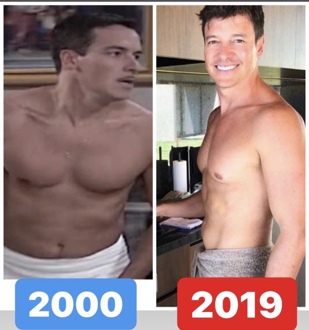 "Quase 20 anos se passaram do Heitor que malhava de toalha na frente do espelho em O Cravo e a Rosa no ano de 2000, para o papai de 3 filhas, que faz churrasco na fazenda só de toalha em 2019", escreveu ele, exibindo a boa forma em ambos os cliques, nas quais aparece só de toalha.
