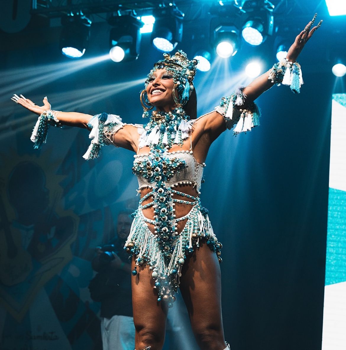 Com um look ousado nas cores azul e branco, a namoradinha do Brasil arrancou aplausos do público e reforçou sua presença icônica no Carnaval carioca. A produção incluiu franjas na cintura e no pescoço, além de um adereço de cabeça no mesmo estilo, criando um visual monocromático e sofisticado.