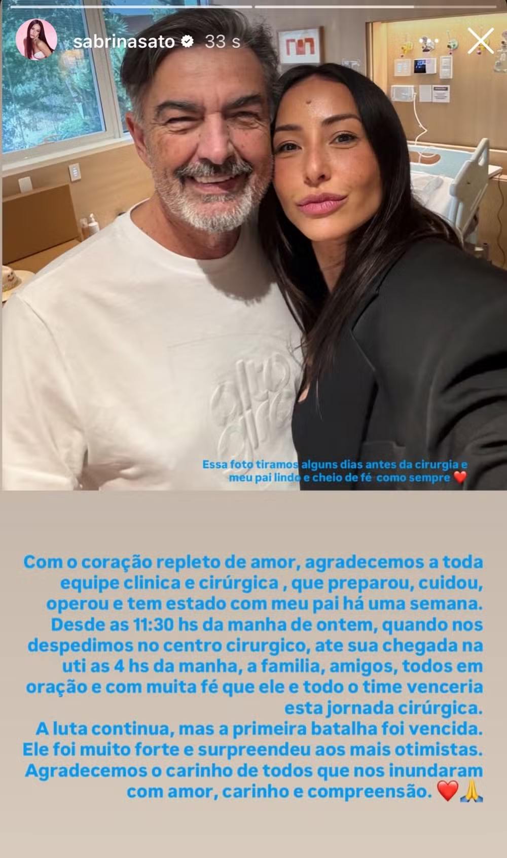 Sabrina Sato usou as redes sociais, nesta quinta-feira (21), para atualizar o estado de saúde de seu pai, Omar Rahal, que passou por uma cirurgia. A apresentadora, que já havia pedido orações, agradeceu o carinho dos fãs, a equipe clínica e cirúrgica, além de revelar como ele está após a operação que durou várias horas. O motivo da operação ainda não foi revelado pela família.