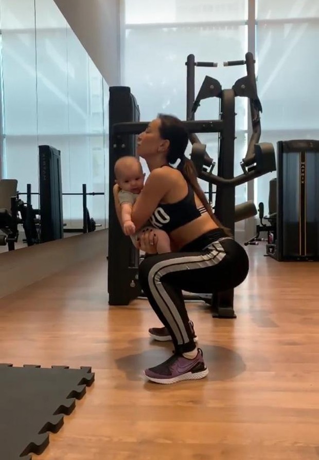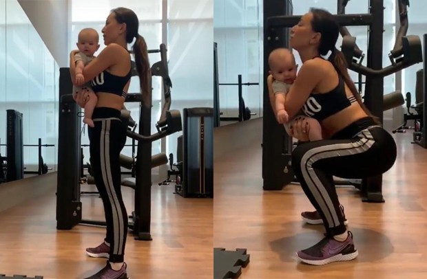 A apresentadora postou sem seu Instagram Stories, na noite de segunda-feira (20), vídeos na qual aparece se exercitando com a filhota no colo, usando a bebê como peso durante o agachamento.