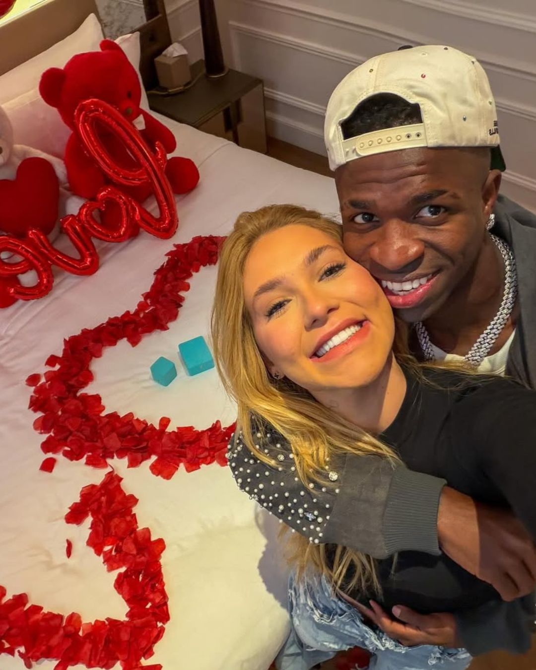 Nas fotos publicadas no Instagram, o jogador mostrou que preparou uma produção digna de cinema, com direito a pétalas de rosas, balões, ursos de pelúcia, buquê e as caixinhas azuis icônicas da Tiffany sobre a cama. O gesto romântico já ultrapassa mais de nove milhões de curtidas.