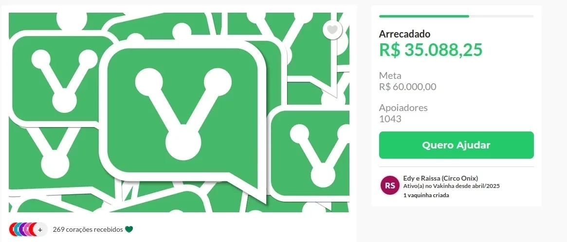 Vaquinha online para Edy e Raissa. Foto: Reprodução