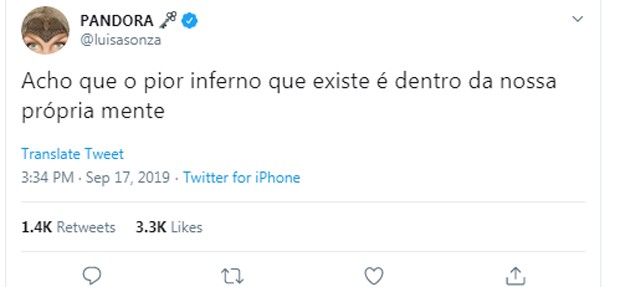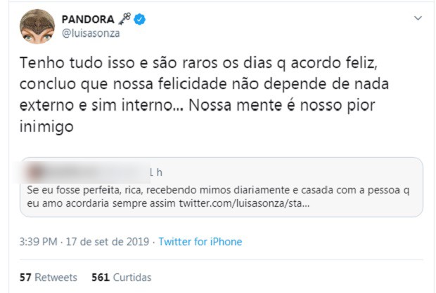 "Acordei feliz", disse Luísa. "Se eu fosse perfeita, rica, recebendo mimos diariamente e casada com a pessoa que eu amo acordaria sempre assim", respondeu a internauta. "Tenho tudo isso e são raros os dias que acordo feliz, concluo que nossa felicidade não depende de nada externo e sim interno... Nossa mente é nosso pior inimigo", escreveu em seguida a cantora. Em outro tweet, Luísa escreveu: "Acho que o pior inferno que existe é dentro da nossa própria mente".