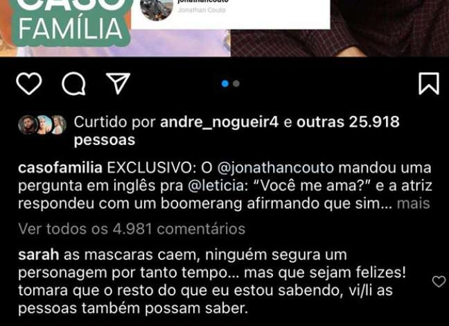 Que Letícia respondeu uma pergunta em inglês de Jonathan Couto. "Você me ama?", perguntou Jonathan, que recebeu uma resposta da atriz, em formato boomerang, afirmando que sim. "Ela respondeu a pergunta do Jonathan e o marcou escondido! O que ela não estava esperando é que daria pra ver no aplicativo, meu pai! O lovezinho entre os dois é real", informou o perfil.