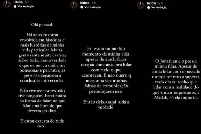 Letícia Almeida usou o Instagram Stories para confirmar a interação com o pai da filha, mas negar um retorno com Jonathan.