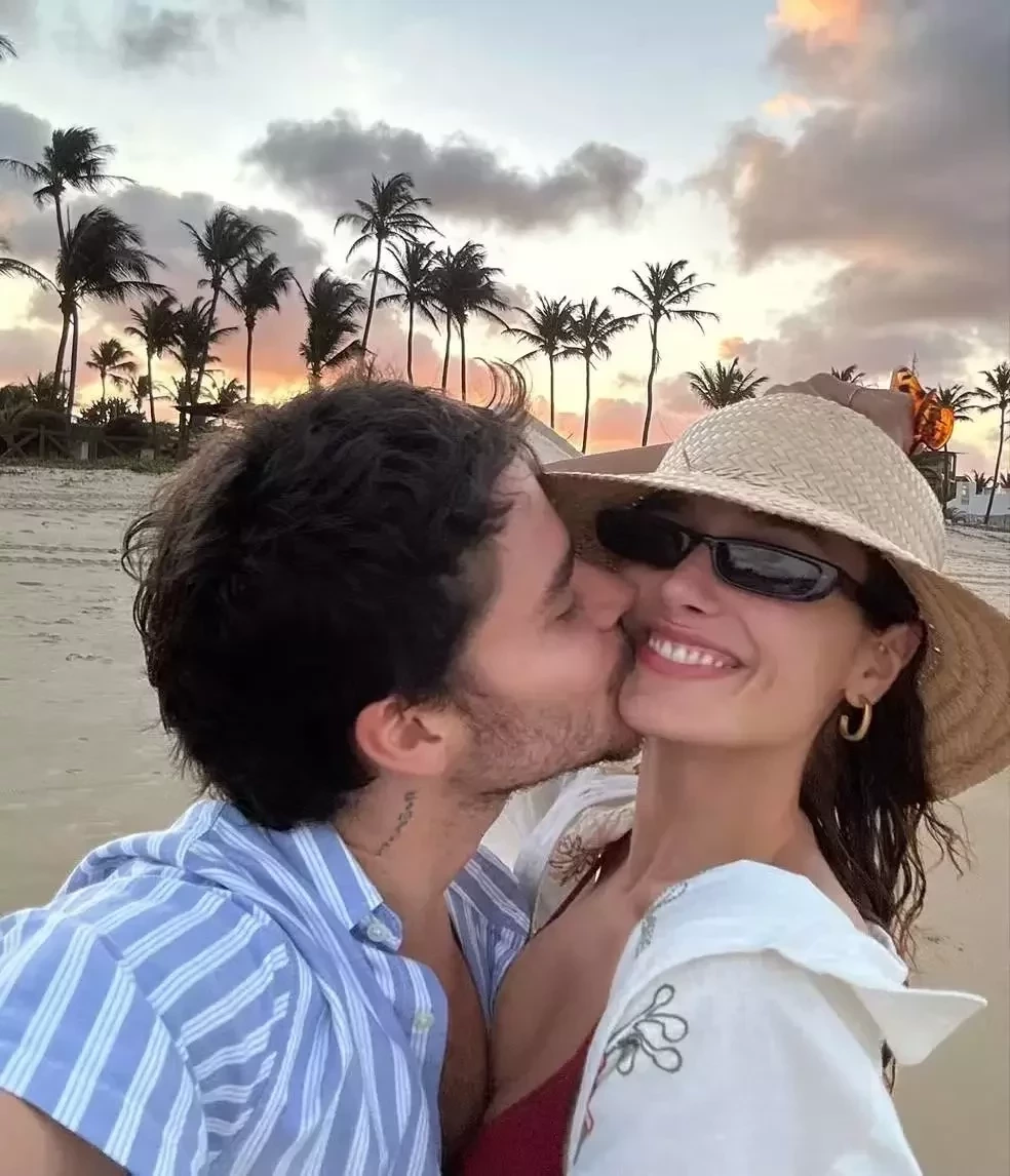De biquíni, a filha de Xuxa Meneghel posa sorridente na praia. Em outro registro, o casal troca carinhos e beijos apaixonados.