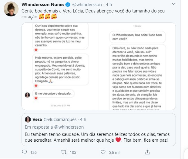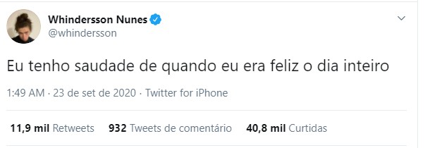 Horas depois, ele fez um desabafo que deixou seus fãs preocupados. "Eu tenho saudade de quando eu era feliz o dia inteiro", declarou ele, que recebeu apoio de vários seguidores, entre eles uma chamada Vera Lucia. "Eu também tenho saudade. Um dia seremos felizes todos os dias, temos que acreditar. Amanhã será melhor que hoje. Fica bem, fica em paz!". "Gente boa demais a Vera Lúcia, Deus abençoe você do tamanho do seu coração", agradeceu Whindersson, compartilhando outras mensagens carinhosas dela.