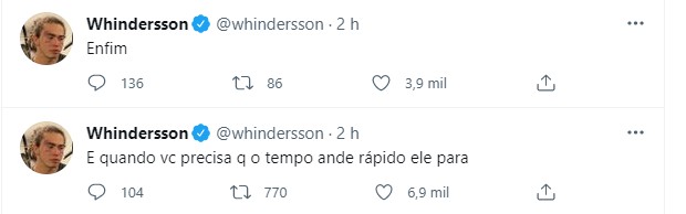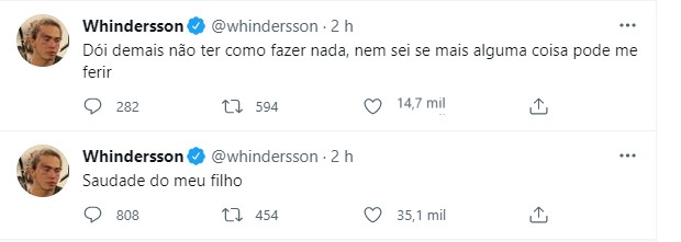 "Saudade do meu filho. Dói demais não ter como fazer nada, nem sei se mais alguma coisa pode", declarou Whindersson. "E quando vc precisa q o tempo ande rápido ele para. Enfim", completou.