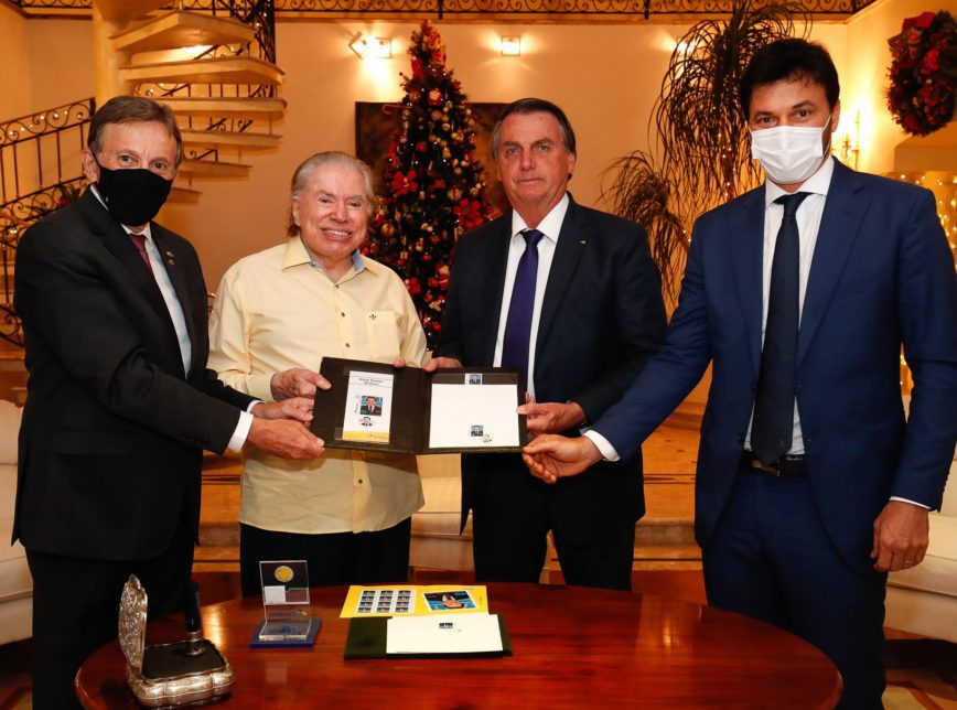 Silvio recebeu Bolsonaro em sua casa junto com o presidente dos Correios, Floriano Peixoto, e o ministro das Comunicações, Fabio Faria, que é também seu genro. Os três foram entregar ao dono do SBT o selo comemorativo lançado por ocasião dos seus 90 anos.