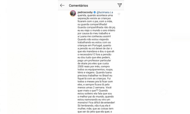 Pedro Scooby resolveu responder a alguns seguidores sobre a mais nova polêmica com a ex-mulher, Luana Piovani. Há alguns dias, ela disse no Instagram que o surfista atrasou a pensão dos filhos, os gêmeos Bem e Liz, de 4 anos, e Dom, de 7. As informações são da Quem.