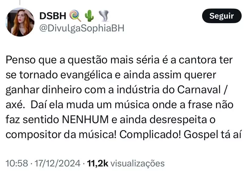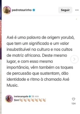 A polêmica ganhou mais força após Ivete Sangalo curtir o post e deixar um comentário. ‘’Sim’’, escreveu a estrela da Macetando, concordando com o posicionamento de Tourinho.