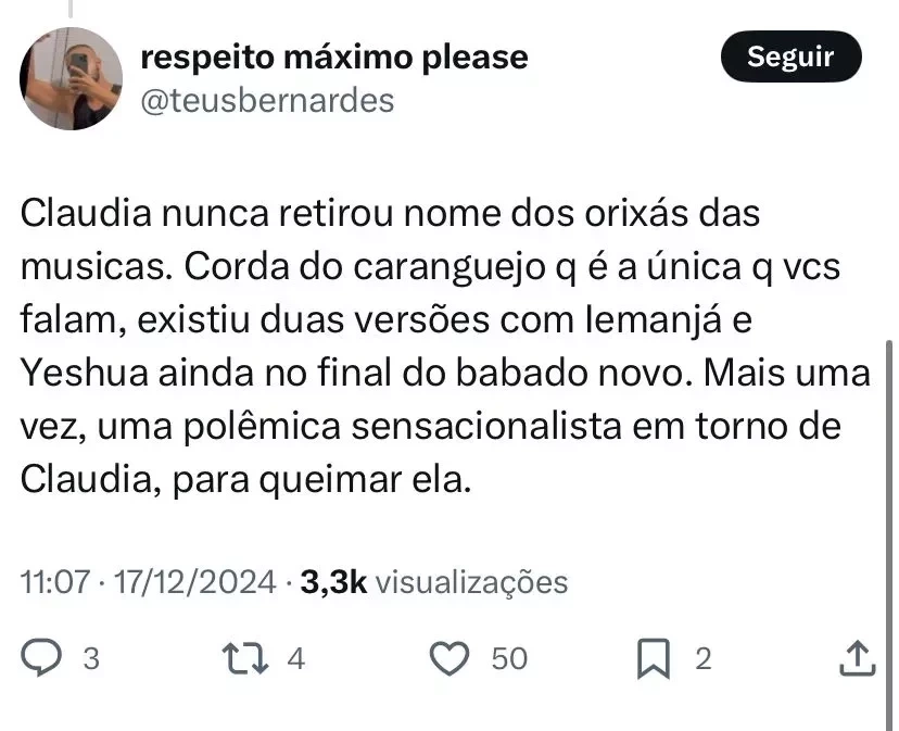 "Quando um artista que se diz parte desse movimento, saúda o povo negro e a cultura, reverencia a percussão e musicalidade, faz sucesso e ganha dinheiro com isso, mas, de repente, escolhe reescrever a história e retirar o nome de Orixás das músicas, não se engane: o nome disso é racismo, e é o surreal e explícito reforço do que houve de errado naquele tempo", iniciou.