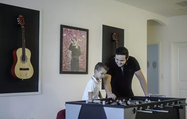 Quando crescer um pouco, João Pedro vai poder aproveitar com o irmão a sala de jogos que, inspirada no tema "Música", tem violões autografados por Matheus na parede para decorar o ambiente, além de mesa de pebolim. "São alguns violões que costumo usar para fazer músicas. Mesmo lá estou trabalhando", explica o goiano.