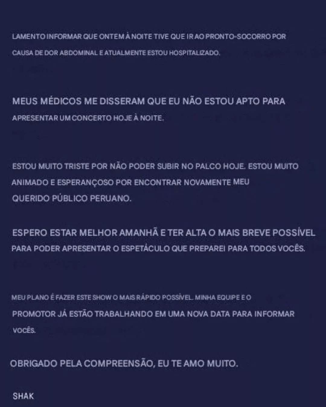 "Espero estar melhor amanhã e ter alta o mais breve possível para poder apresentar o espetáculo que preparei para todos vocês. Meu plano é fazer este show o mais rápido possivel. Minha equipe e o promotor já estão trabalhando em uma nova data para informar voces: Obrigado pela compreensão, eu te amo muito, Shakira"