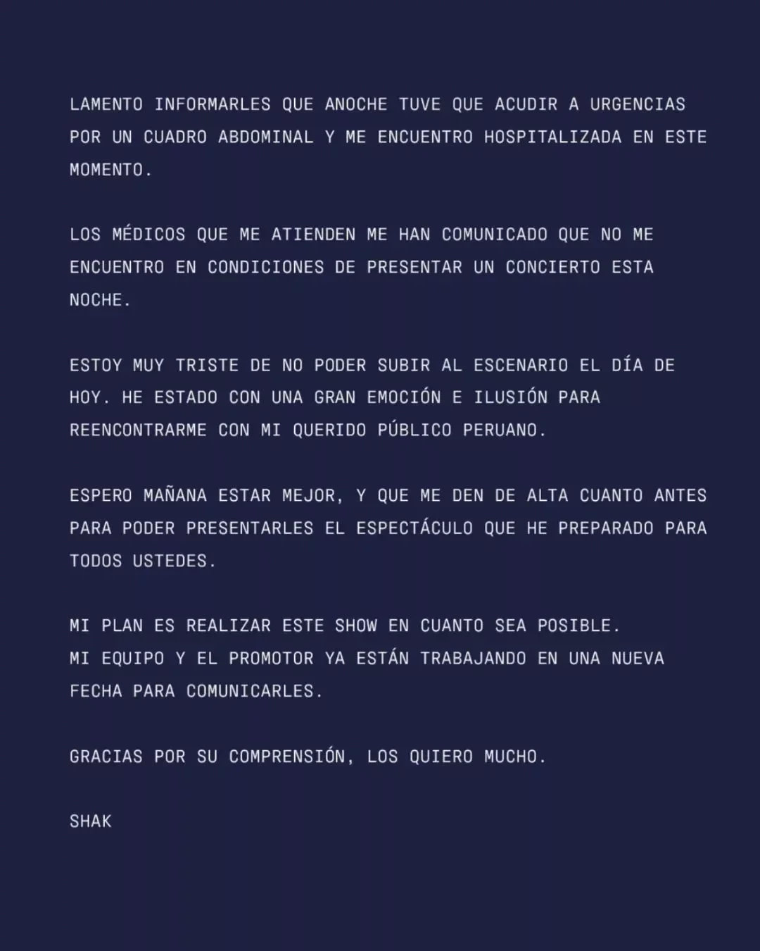 "Lamento informar que ontem a noite tive que ir ao pronto-socorro por causa de dor abdominal e atualmente estou hospitalizada. Meus médicos me disseram que eu não estou apta para apresentar um show hoje à noite. Estou muito triste por não poder subir no palco hoje, estou muito animada e esperançosa pra encontrar novamente meu querido publico peruano"