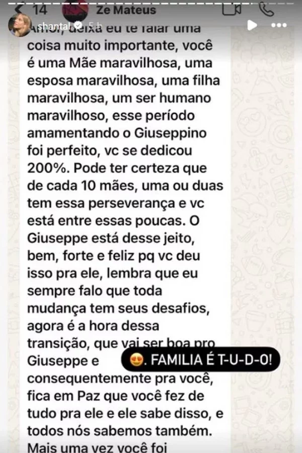 Apesar do momento difícil, ela contou que o filho está bem e seguirá assim mesmo sem o aleitamento materno. Shantal também compartilhou mensagens de apoio que recebeu do marido, Mateus Verdelho, de 41 anos, e agradeceu a compreensão dos seguidores.