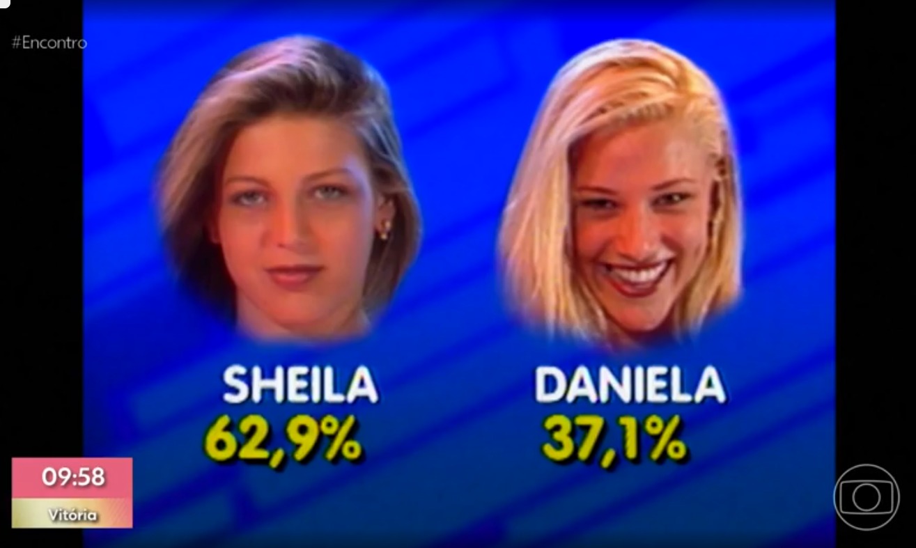 Momento capturado do Encontro com Patricia Poeta onde mostra o resultado da votação que elegeu Sheila Mello como a Nova Loira do Tchan. Foto: Reprodução/TV Globo