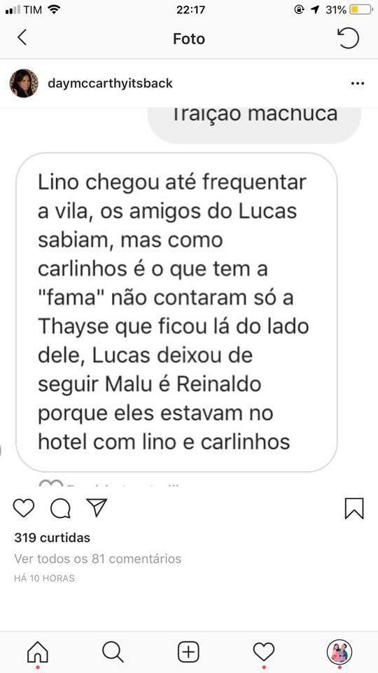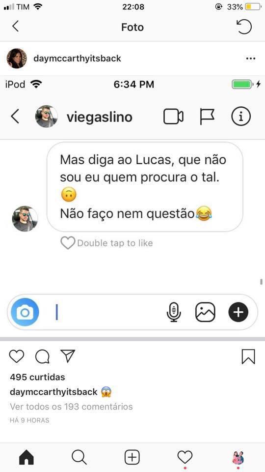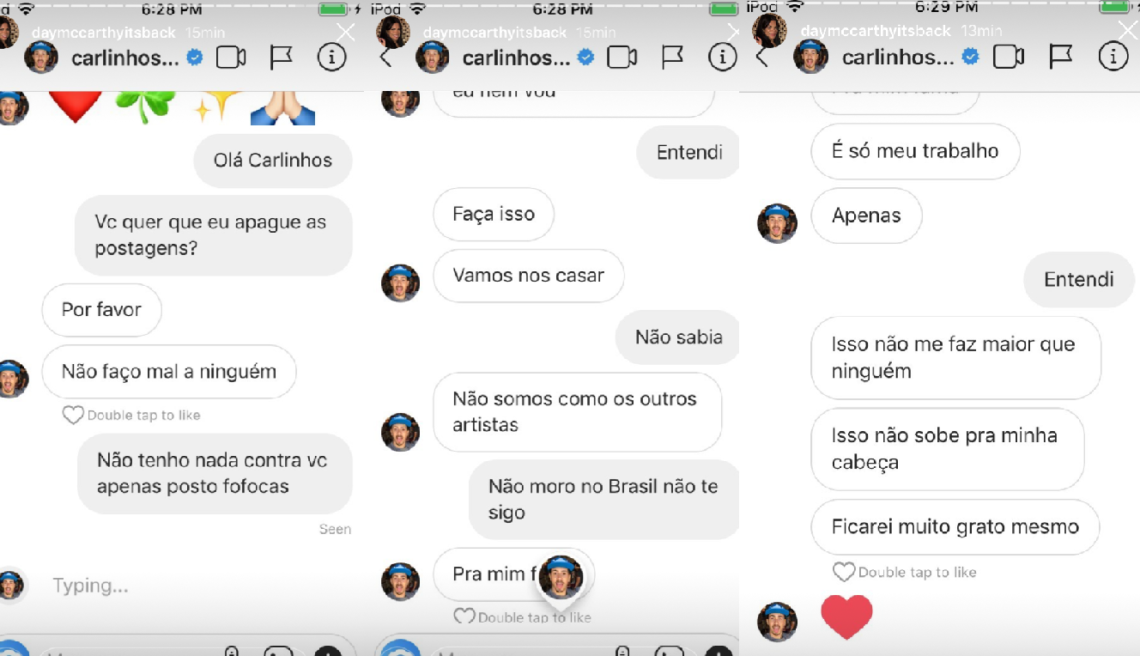 Ela ainda postou que Carlinhos Maia foi até o direct dela no Instagram e pediu para ela apagar as postagens.