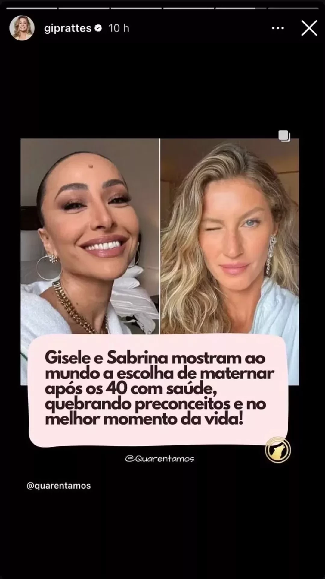 No texto divulgado pela mãe de Nicolas Prattes, de 27 anos, lê-se: "Gisele e Sabrina mostram ao mundo a escolha de maternar após os 40 com saúde, quebrando preconceitos e no melhor momento da vida".