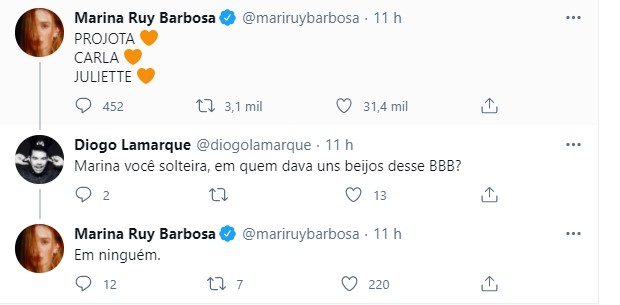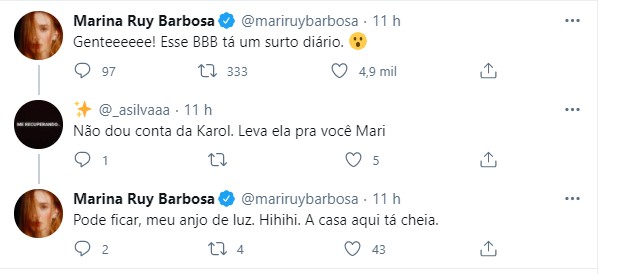 Marina ainda demonstrou que, assim como alguns famosos, não está gostando da postura de Karol Conká no programa ao responder uma pessoa. "Não dou conta da Karol. Leva ela pra você, Mari", comentou um seguidor. "Pode ficar, meu anjo de luz. Hihihi. A casa aqui tá cheia", brincou a atriz.
