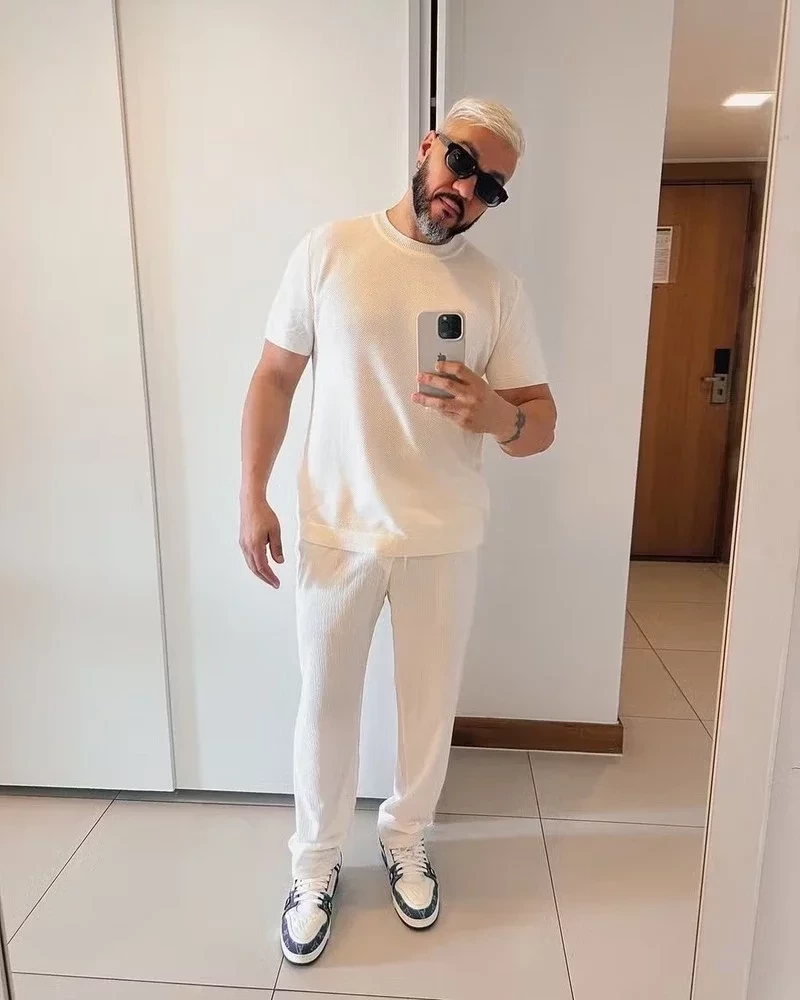 Belo causou alvoroço entre seus seguidores nesta terça-feira (25) ao compartilhar selfies vestindo um look todo branco em um quarto de hotel. O cantor, que está solteiro desde o término de seu casamento com Gracyanne Barbosa, raramente posta fotos desse tipo no Instagram, sendo a maioria de suas publicações composta por fotos profissionais tiradas em shows.