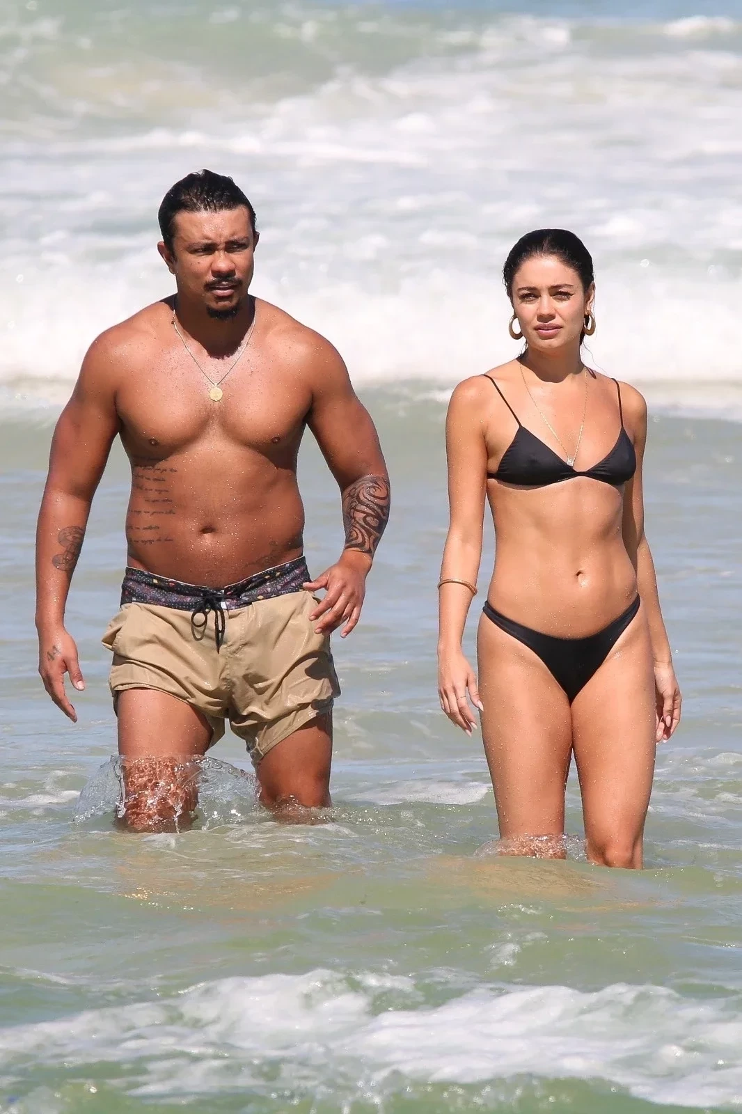 O casal foi flagrado trocando beijos apaixonados enquanto banhava no mar. Após o momento de carícias, as estrelas da novela das 21h foram embora de mãos dadas. A atriz estava com um biquíni fio-dental preto e o cantor usava uma bermuda bege.