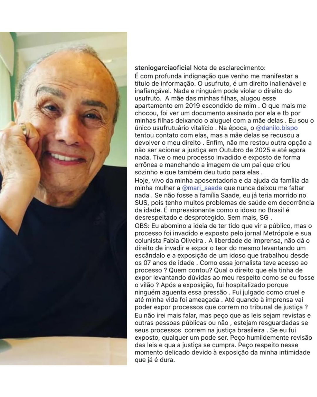 O ator Stenio Garcia tornou pública, no último dia 27 de março, sua posição sobre a ação judicial movida contra as próprias filhas, no Rio de Janeiro. Aos 94 anos, ele acusa familiares de se apropriarem de um apartamento em Ipanema destinado ao seu uso vitalício, após tentativas frustradas de resolver o conflito de forma privada.