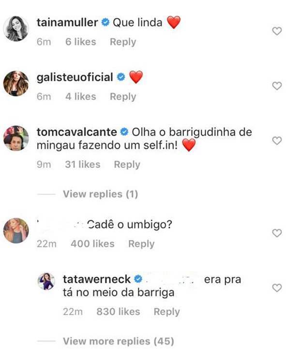Entre os muitos elogios pela barriga, uma internauta fez um comentário sobre o umbigo de Tatá, que na gestação ficou bem pequenino. "Cadê o umbigo?", perguntou a seguidora da humorista. "Era para tá no meio da barriga", disparou a apresentadora.