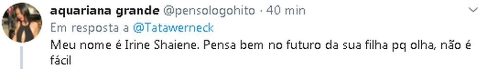 "Finalmente pensei em um nome pra minha filha e a reação de todas as pessoas foi 'Você tá de sacanagem né?'. Acho que tô no caminho certo", revelou. Depois disso, os fãs de Tatá entraram na brincadeira. Além de pedir dicas e dar conselhos, eles "apostaram" que nome deve ser esse.