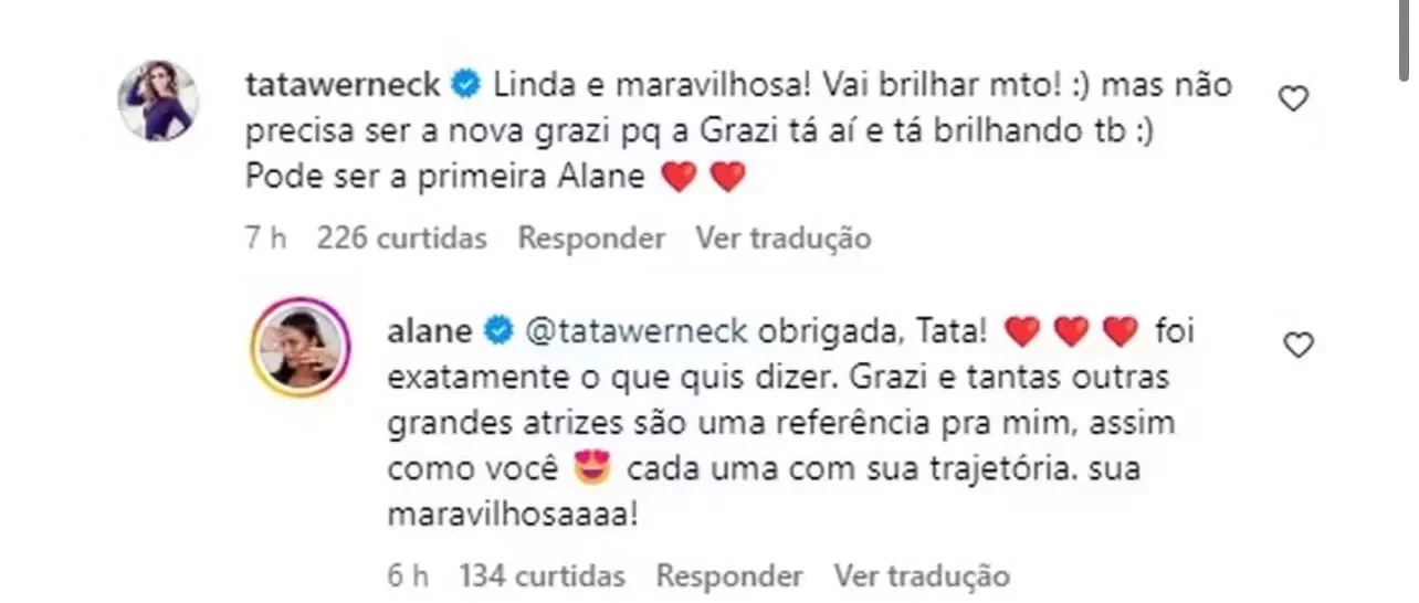 "Obrigada, Tata! Foi exatamente o que quis dizer. Grazi e tantas outras grandes atrizes são uma referência pra mim, assim como você. Cada uma com sua trajetória. Sua maravilhosa!".