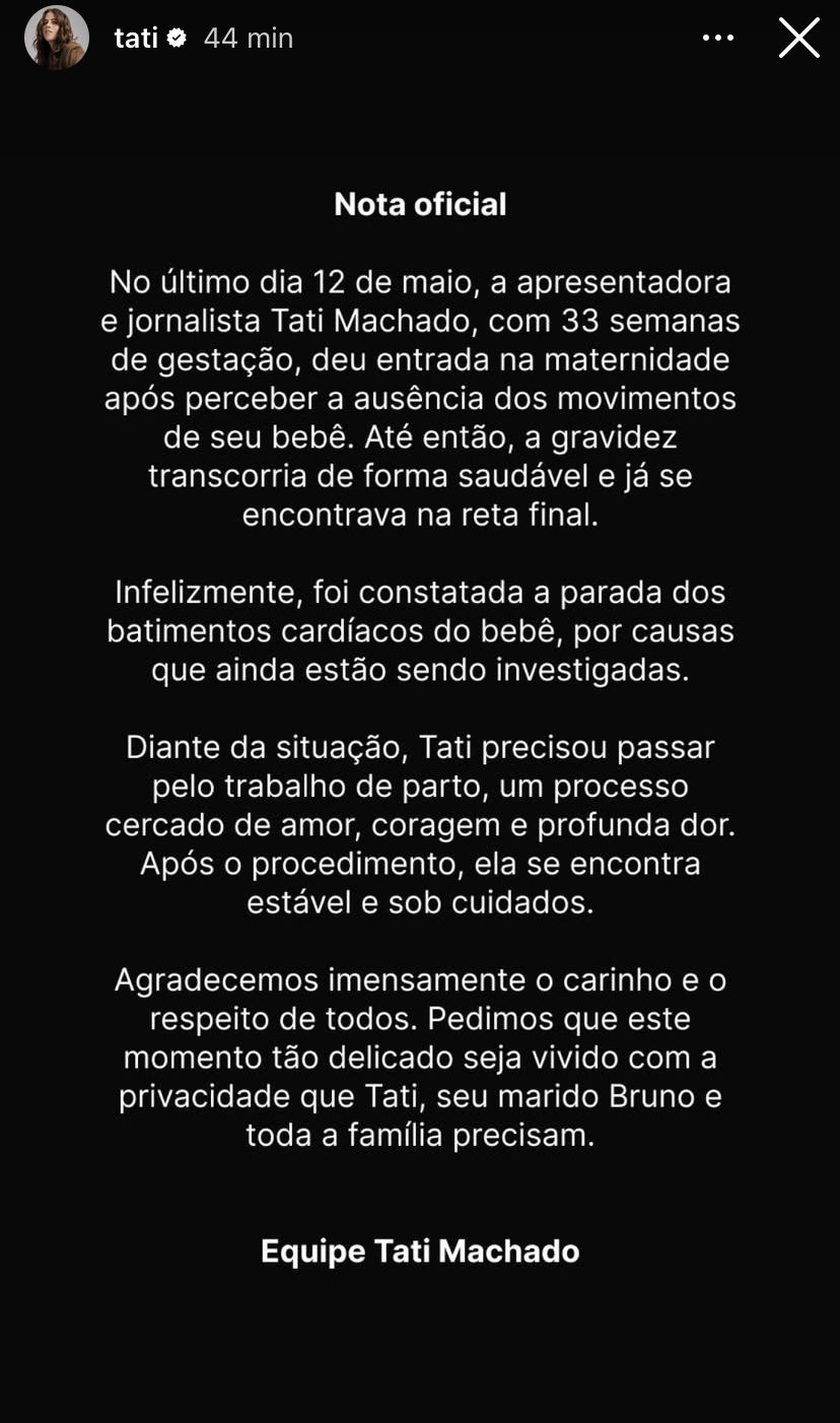 ''Agradecemos imensamente o carinho e o respeito de todos. Pedimos que este momento tão delicado seja vivido com a privacidade que Tati, seu marido Bruno, e toda família precisam'', completou o texto.