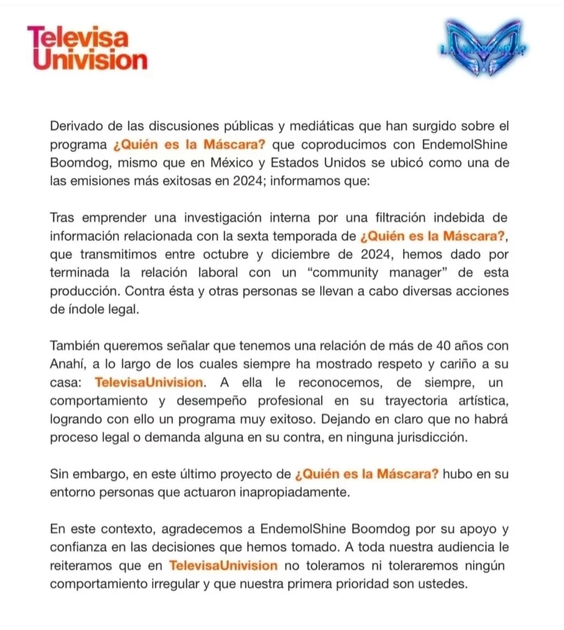 Após muitos rumores sobre uma possível investigação contra Anahí por manipulação de imprensa e vazamento de informações, a Televisa quebrou o silêncio e publicou um comunicado negando que a ex-RBD tenha violado o contrato ou cometido fraudes. Além de esclarecer a polêmica, a emissora mexicana atribuiu o erro ao vazamento de dados realizado por um funcionário.