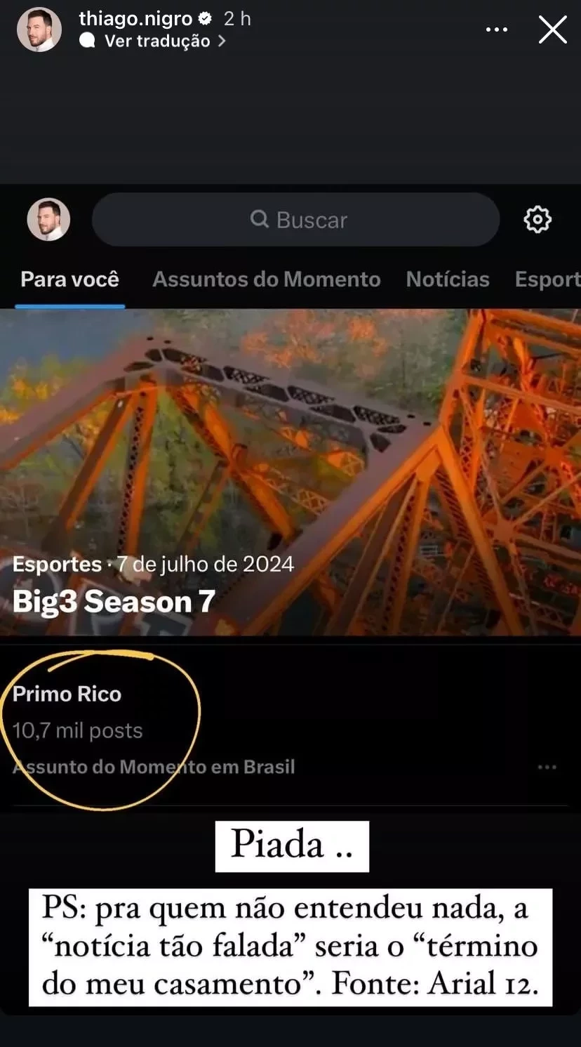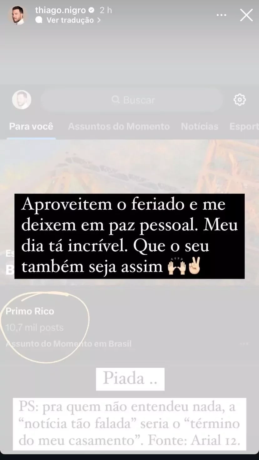 Após Maíra Cardi negar o fim do casamento, foi a vez de Thiago Nigro se pronunciar sobre o assunto nesta terça-feira (9). Atrávés dos Stories do Instagram, o empresário compartilhou um print que mostra seu nome entre os assuntos mais comentados no X (antigo Twitter).