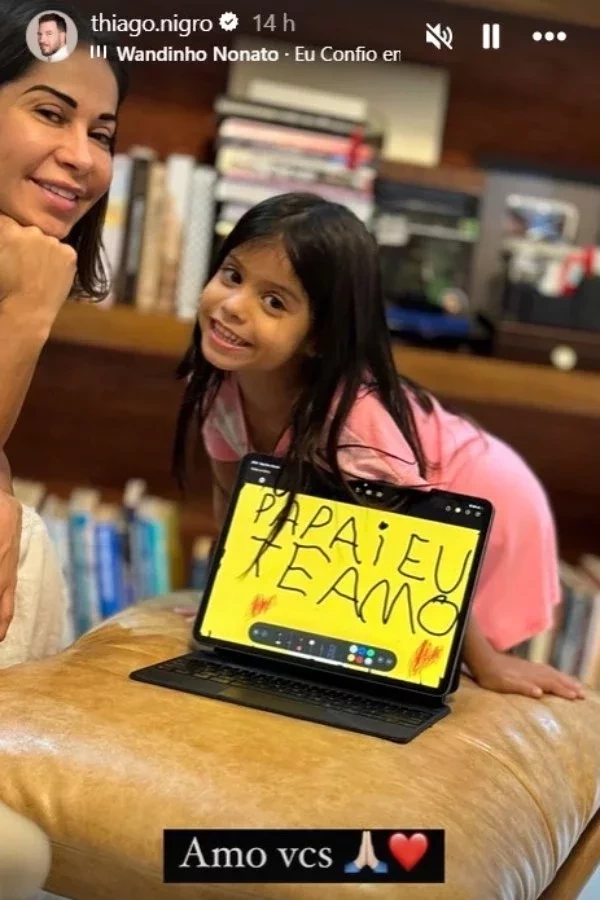Thiago Nigro, casado com Maíra Cardi, causou polêmica nas redes sociais nesta terça-feira (3), após compartilhar uma foto da esposa e de sua enteada, Sophia Cardi Aguiar, de 5 anos. No story, a menina aparece mostrando um desenho com a frase “Papai, te amo”.