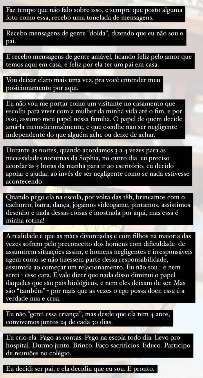 No entanto, ele não esqueceu do pai biológico de Sophia e deixou claro que seu papel não exclui o de Arthur Aguiar. Sem citar o nome do ex-BBB, ele aproveitou para dar uma alfinetada nele: “Nada disso diminui o papel daqueles que são pais biológicos, e nem eles deixam de ser. Mas são ‘também’ — por mais que, às vezes, o ego possa doer, essa é a verdade nua e crua. Eu não ‘gerei’ essa criança, mas desde que ela tinha 4 anos, convivemos juntos 24 de cada 30 dias”.