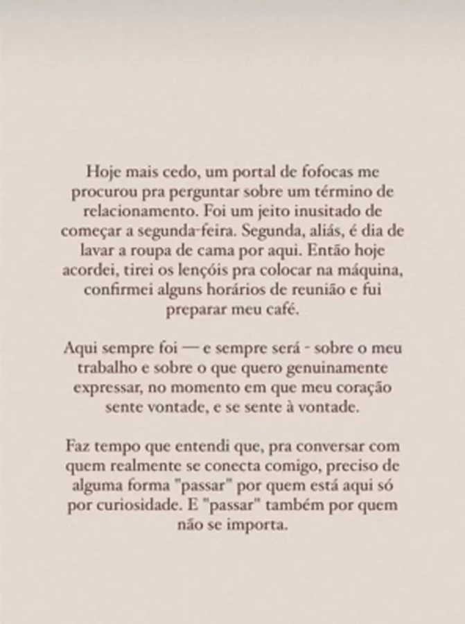 "Aos curiosos: eu entendo. Às vezes também sinto esse tipo de curiosidade. Inclusive sei que o tema 'relacionamentos' geralmente desperta esse sentimento. Só posso desejar que vocês estejam ainda mais curiosos pela vida de vocês. Tenho certeza de que isso trará mais benefícios. E sei que a vida de vocês – assim como a minha – está passando", acrescentou.