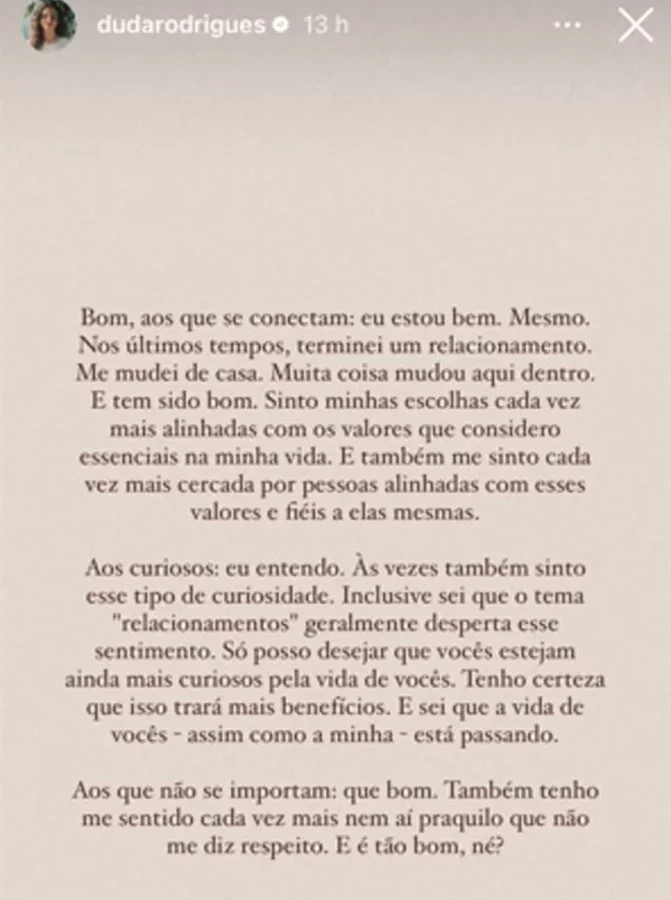 O anúncio do término foi feito em seus stories na rede social. Duda, inclusive, contou que se mudou após a separação. “Bom, aos que se conectam: eu estou bem. Mesmo. Nos últimos tempos, terminei um relacionamento. Me mudei de casa. Muita coisa mudou aqui dentro. E tem sido bom. Sinto minhas escolhas cada vez mais alinhadas com os valores que considero essenciais na minha vida. E também me sinto cada vez mais cercada por pessoas alinhadas com esses valores e fiéis a elas mesmas", começou.