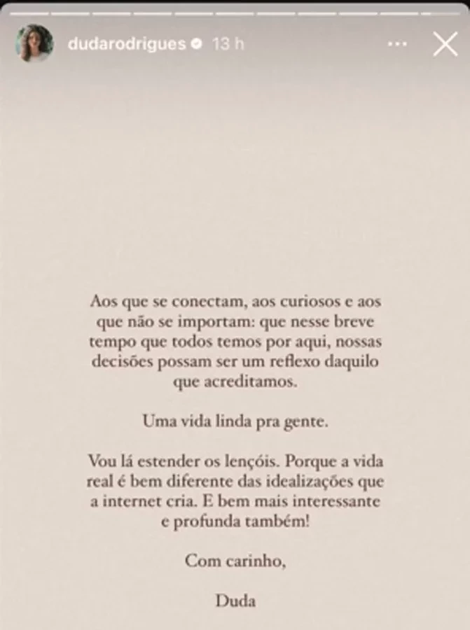 Duda finalizou a publicação fazendo uma reflexão sobre as decisões tomadas em sua vida. “Aos que se conectam, aos curiosos e aos que não se importam: que, nesse breve tempo que todos temos por aqui, nossas decisões possam ser um reflexo daquilo que acreditamos. Uma vida linda pra gente. Vou lá estender os lençóis. Porque a vida real é bem diferente das idealizações que a internet cria", concluiu.