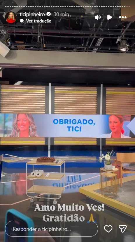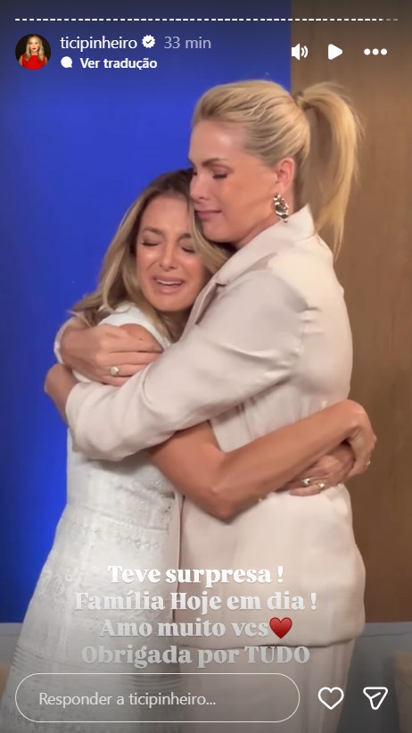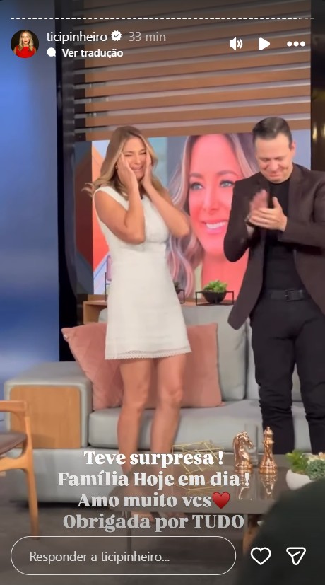 A surpresa aconteceu logo após o encerramento da edição do Hoje em Dia. Ainda no estúdio, apresentadores e profissionais dos bastidores aplaudiram Ticiane Pinheiro e a abraçaram. Nos telões, a emissora exibiu a mensagem “Obrigado, Tici!”, acompanhada por fotos que relembraram momentos da trajetória da apresentadora.