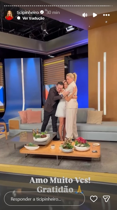 O momento da despedida foi registrado e publicado por Ticiane nas redes sociais. Em uma das postagens, a apresentadora escreveu: “Teve surpresa! Família Hoje em Dia, amo muito vocês. Obrigada por tudo!”.